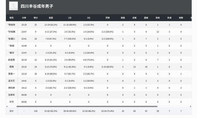 四川男籃:胡金秋25分6板1助3帽、周琦24分18板1助、趙巖昊22分6板7助、景菡一18分3板3助、趙嘉仁16分6板2助2帽、孫銘徽9分4板12助4斷。