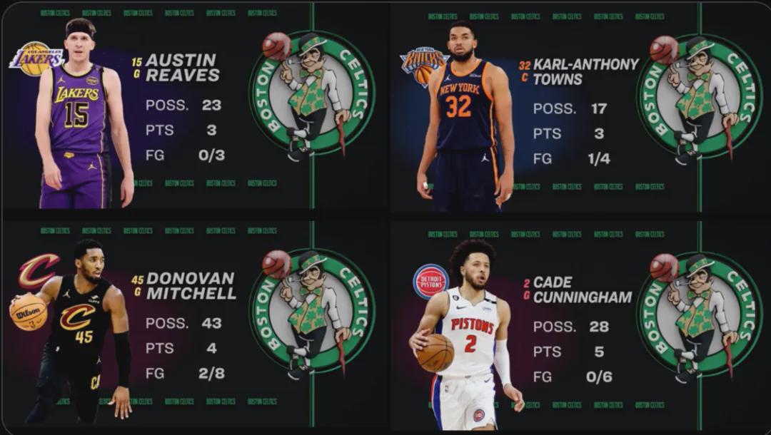 JJJ在他面前5次出手顆粒無收。連進(jìn)化成硬糖的唐斯,和沃爾什17次對(duì)位,也只拿了3分......賽季至今,他有12%的時(shí)間防守中鋒,而他并沒有被這些大個(gè)子用身高霸凌。反而他們?cè)谖譅柺策@里吃不了兜著走,命中率只有31.6%......