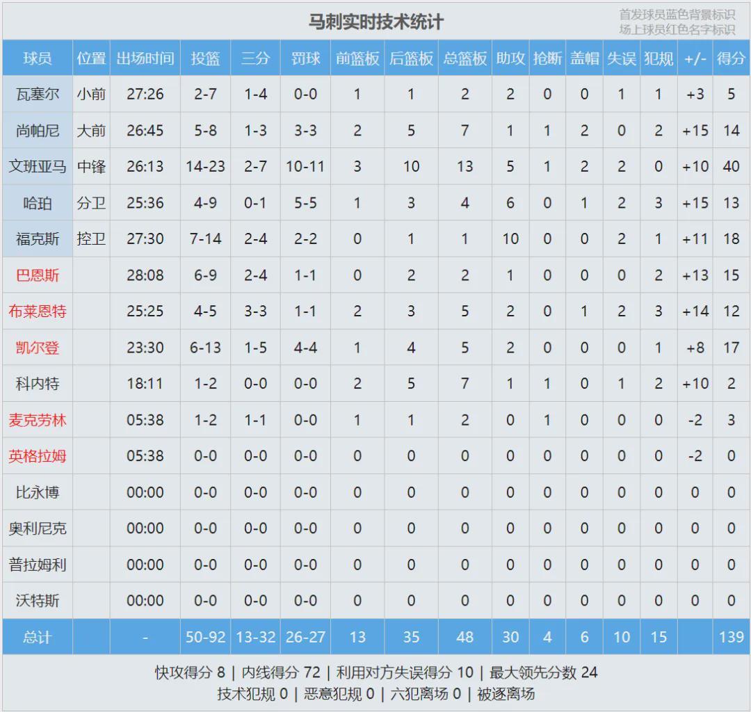 本賽季文班打了64場(chǎng)常規(guī)賽,其中54場(chǎng)首發(fā)。場(chǎng)均出戰(zhàn)29.1分鐘,得到25分11.5籃板3.1助攻1搶斷3.1蓋帽2.4失誤2.4犯規(guī),三項(xiàng)命中率:51.2%,34.9%,82.7%。場(chǎng)均得分聯(lián)盟第13,場(chǎng)均籃板聯(lián)盟第4,場(chǎng)均蓋帽聯(lián)盟第1!
