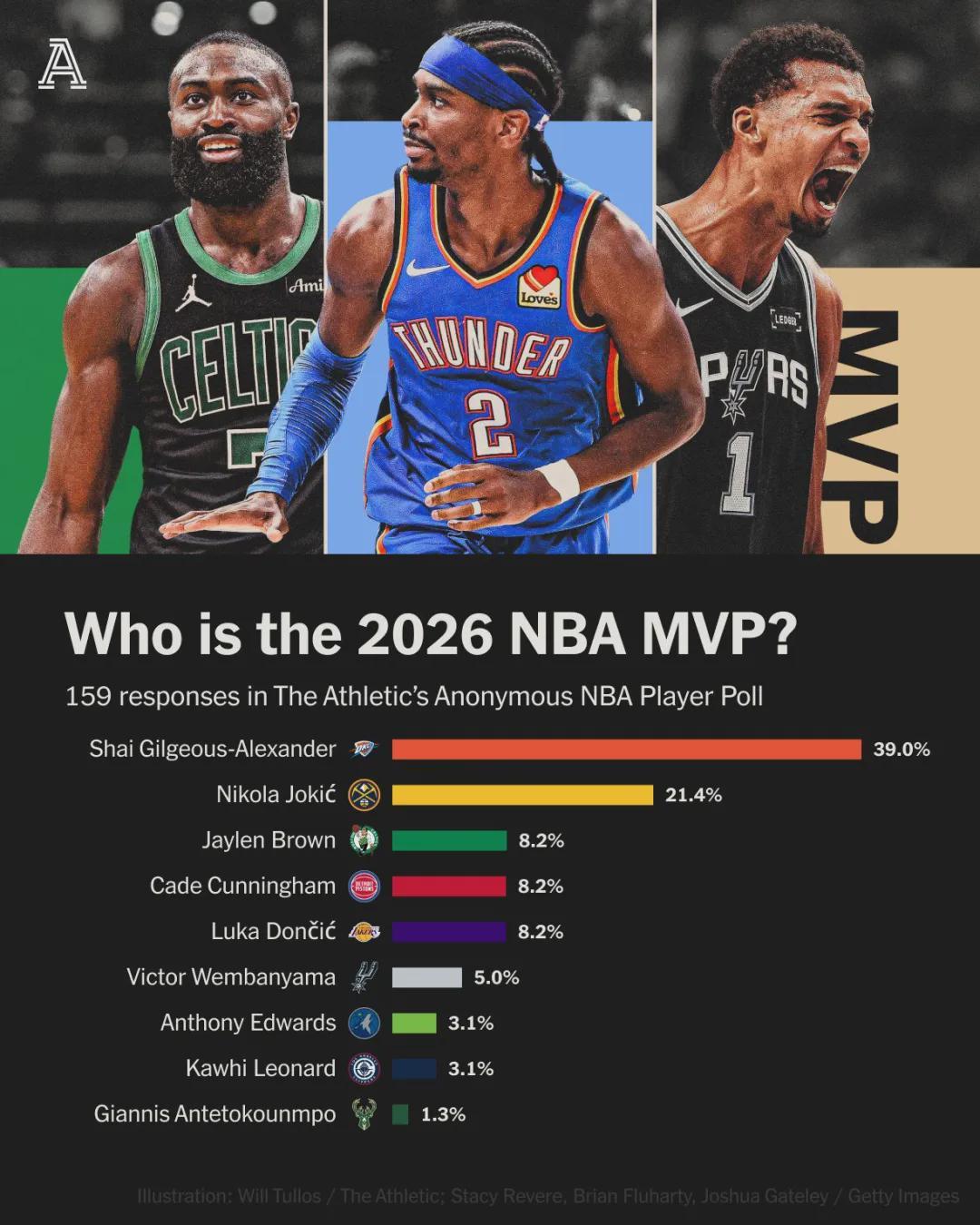 美媒The Athletic針對(duì)159名現(xiàn)役球員,做了一項(xiàng)調(diào)查:有39%的球員選擇亞歷山大為本賽季MVP,約基奇21.4%排名第二,文班5%僅排第六。不過(guò)DPOY肯定穩(wěn)了,22歲的文班將超過(guò)霍華德(23歲),成為最年輕的DPOY!