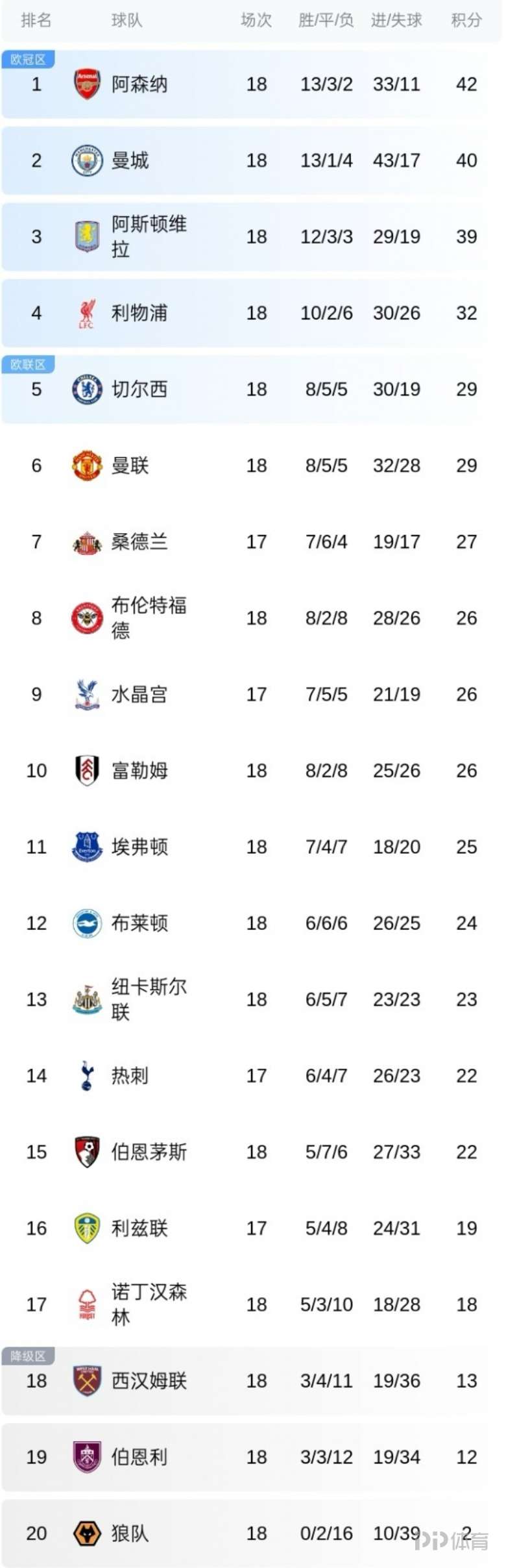 英超積分榜:阿森納2分優(yōu)勢領(lǐng)先曼城 紅軍藍(lán)軍紅魔4-6位
