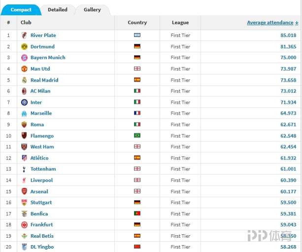 德轉(zhuǎn)統(tǒng)計2025年全球頂級聯(lián)賽俱樂部場均觀眾數(shù)據(jù)中,河床、多特、拜仁排在前三,中超球隊大連英博排在第20位。
