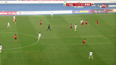 第34分鐘,廣東擴(kuò)大比分!易縣龍中路弧頂接時(shí)子豪橫傳球一腳遠(yuǎn)射龐焯熙撲救失誤黃油手球彈進(jìn)球門,廣東2-0中國(guó)香港。