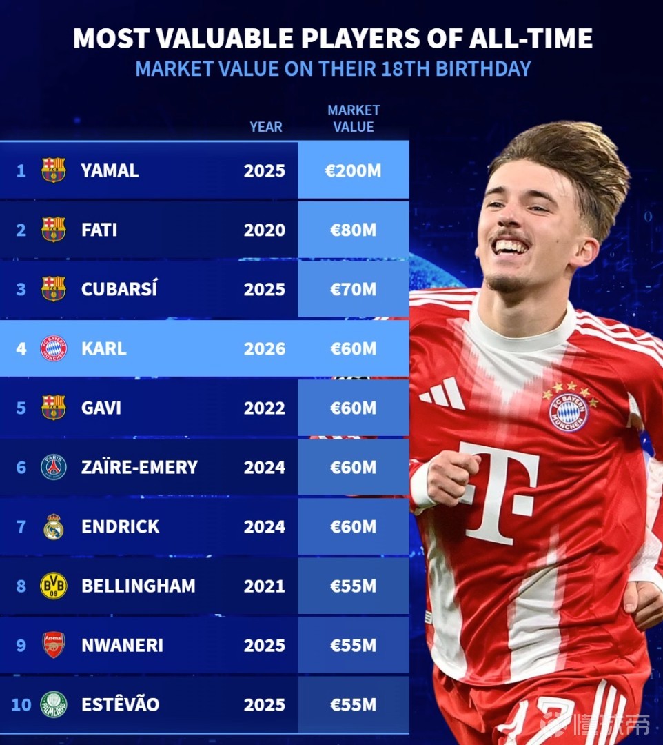 北京時(shí)間2月22日,在拜仁慕尼黑新星倫納特-卡爾迎來18歲生日的情況下,德轉(zhuǎn)統(tǒng)計(jì)出了18歲生日當(dāng)天德轉(zhuǎn)身價(jià)排名前10的球員,倫納特-卡爾位列第四。