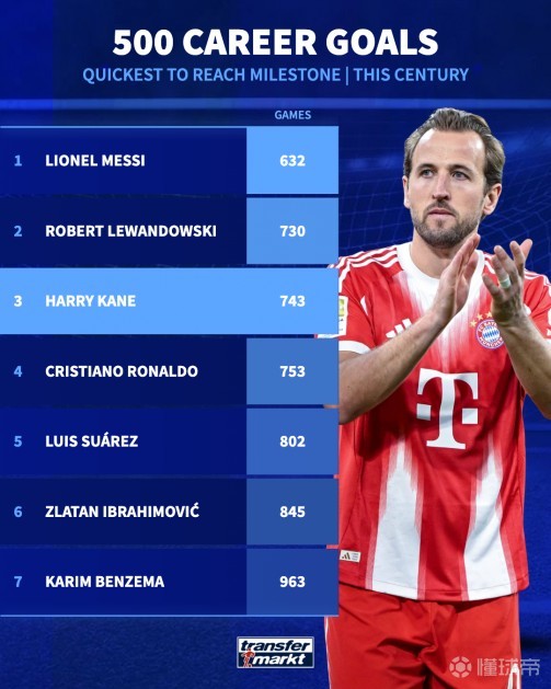 值得一提的是,凱恩僅用743場比賽,便達成了職業(yè)生涯500球成就。自2000年以來,世界足壇僅有7位球星成功解鎖職業(yè)生涯500球里程碑,而凱恩則成為了達成這一目標第三快的球員。排在榜首的是梅西,這位巴薩傳奇僅用632場比賽就打進了500球,如今38歲的他依舊狀態(tài)火熱,職業(yè)生涯總進球數(shù)已達到902球。排名第二的是萊萬多夫斯基,他用730場比賽完成了500球里程碑。除此之外,C羅(753場)和蘇亞雷斯(802場)也成功躋身前五,伊布拉希莫維奇(845場)和本澤馬(963場)緊隨其后。