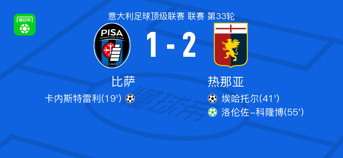 北京時(shí)間4月20日意大利足球甲級(jí)聯(lián)賽第33輪,比薩主場(chǎng)迎戰(zhàn)熱那亞。比賽中,比薩球員卡內(nèi)斯特雷利率先破門;隨后熱那亞球員埃哈托爾、洛倫佐-科隆博先后建功。最終比分定格為比薩1-2熱那亞。
