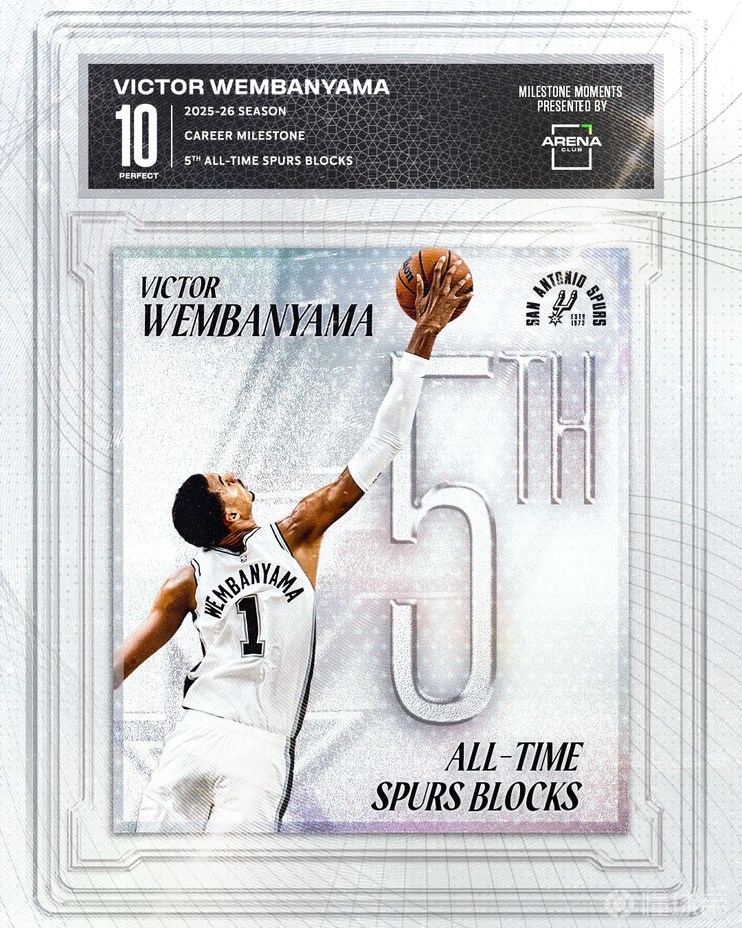 在比賽開局不到2分鐘時,文班就已經(jīng)送出3次封蓋,至此,他的生涯蓋帽總數(shù)來到544次,超越比利-鮑爾茲,升至馬刺隊史第5位。