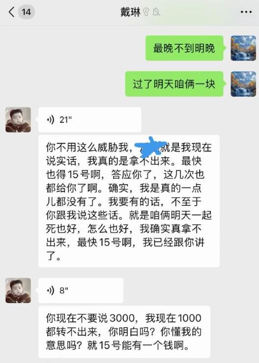 不過(guò),戴琳表示自己目前手頭確實(shí)沒(méi)有錢(qián),需要到15號(hào)才能還錢(qián)。