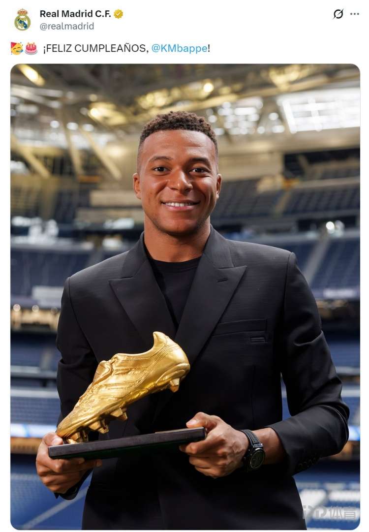 今天是姆巴佩的27歲生日,皇馬官方為他送上祝福?;蜀R官方社媒曬出姆巴佩手捧金靴獎杯的照片,配文:“生日快樂,姆巴佩!”
