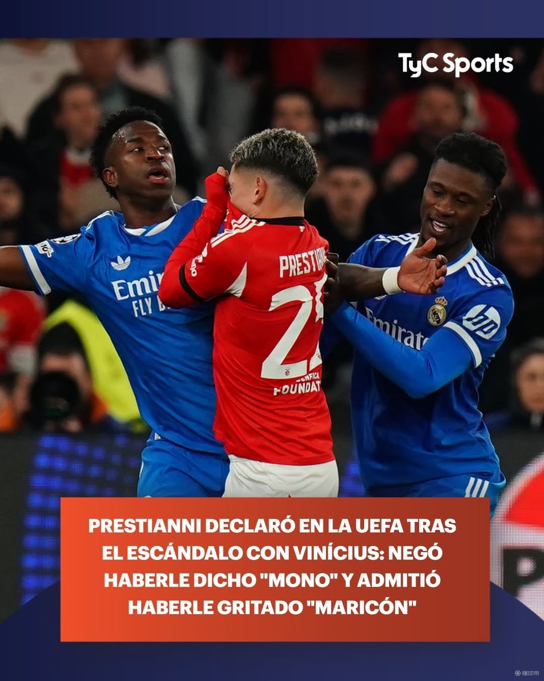 TyC在報道中稱,普雷斯蒂安尼向歐足聯(lián)表示,在維尼修斯進(jìn)球后,他沒有沖對方喊“猴子”,不存在種族歧視行為。但他承認(rèn),自己曾對著維尼修斯喊“基佬”。TyC還表示,普雷斯蒂安尼預(yù)計(jì)可以參加與皇馬的次回合比賽。