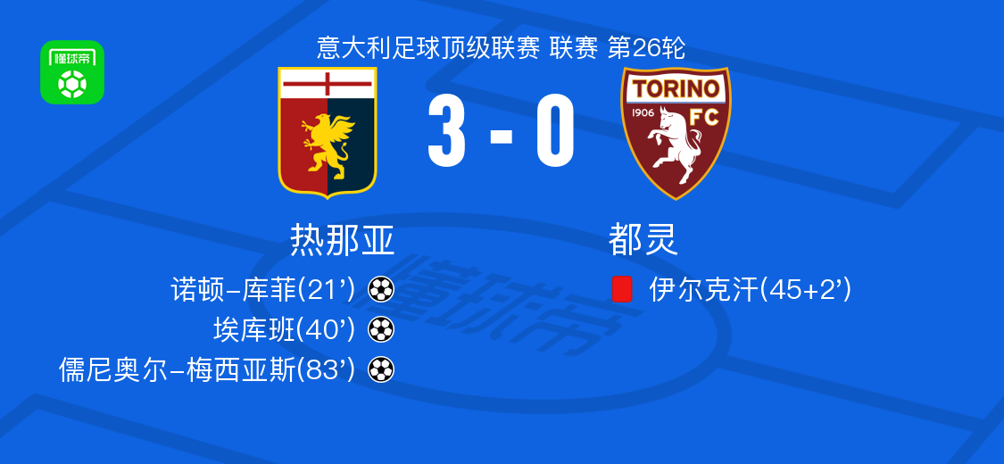 北京時(shí)間2月22日意大利足球甲級(jí)聯(lián)賽第26輪,熱那亞主場(chǎng)對(duì)陣都靈。比賽中諾頓-庫(kù)菲率先為熱那亞建功,隨后埃庫(kù)班擴(kuò)大領(lǐng)先優(yōu)勢(shì);上半場(chǎng)補(bǔ)時(shí)階段都靈一名球員被紅牌罰下,此后儒尼奧爾-梅西亞斯再入一球鎖定勝局。最終熱那亞以3-0戰(zhàn)勝都靈。